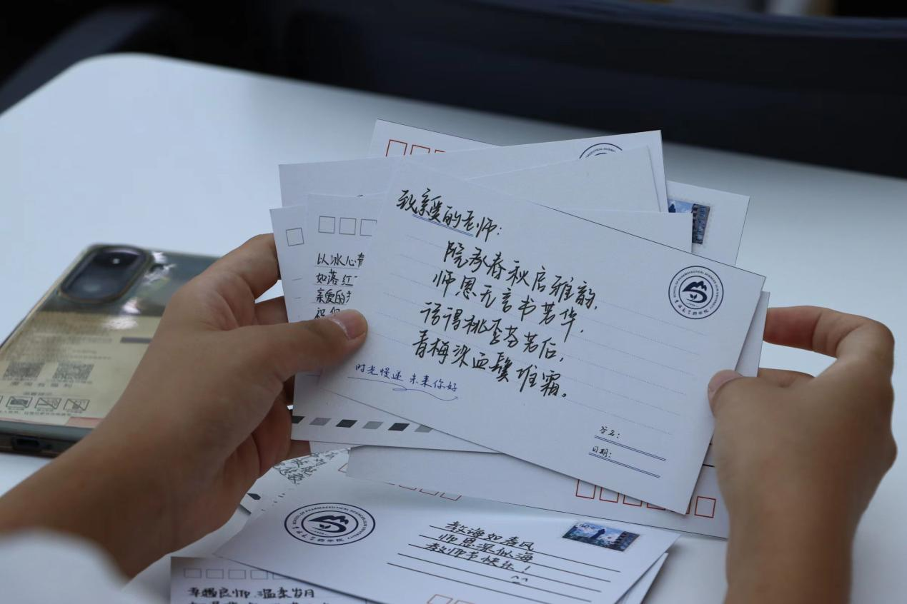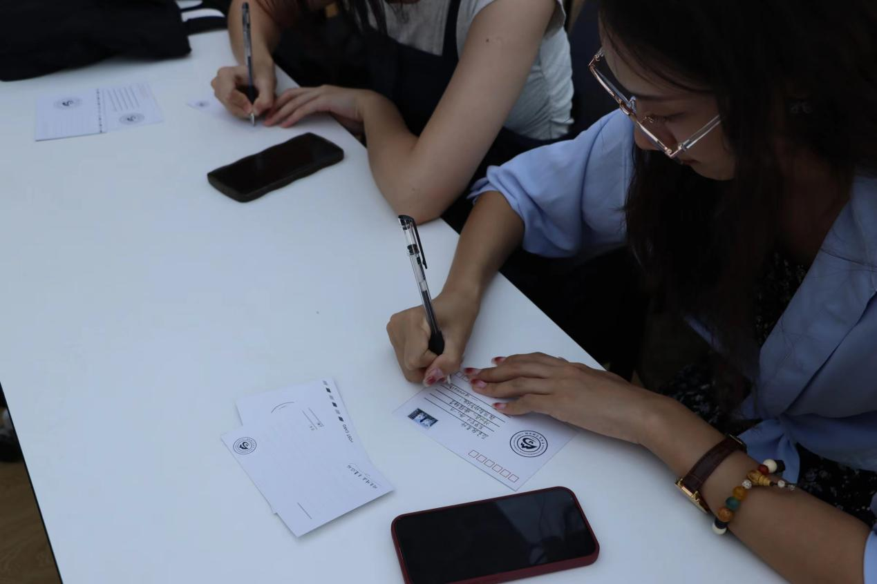 学生工作办公室为同学们准备了精美的学院定制明信片,活动当日有40余名同学到场,诚挚地写下自己对老师的深深感恩和祝福。活动现场,同学们思量许久才肯下笔。一横一竖,或是想到了一句句恳切的话语;一撇一捺,或是回忆起一堂堂精彩的课程。只是小小卡片,写不完星辰大海;寥寥数语,道不尽师生情谊。