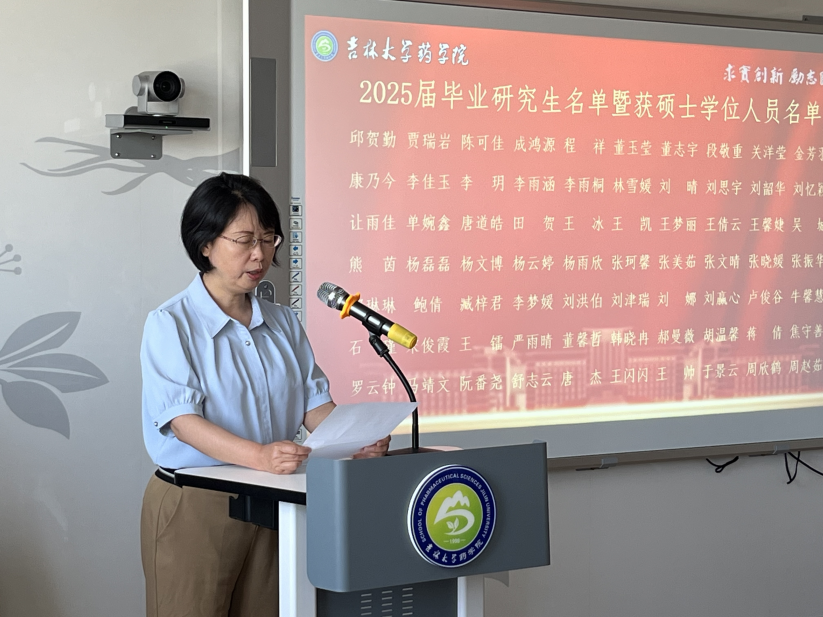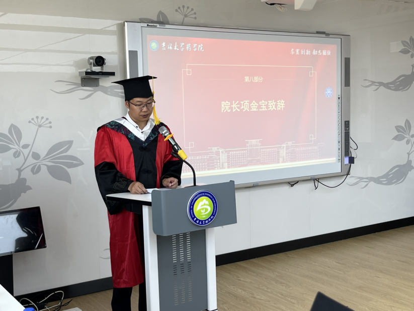 典礼最后,项金宝院长发表致辞。他高度赞扬了毕业生们在科研攻坚中展现的“求实创新、励志图强”的吉大精神,并向大家顺利完成学业表示热烈祝贺。展望未来,项金宝院长勉励毕业生坚定信念、勇毅前行,时刻以“药学人”为荣,勇敢肩负时代重任,为守护人民生命健康、推动中国医药事业蓬勃发展贡献智慧与力量。