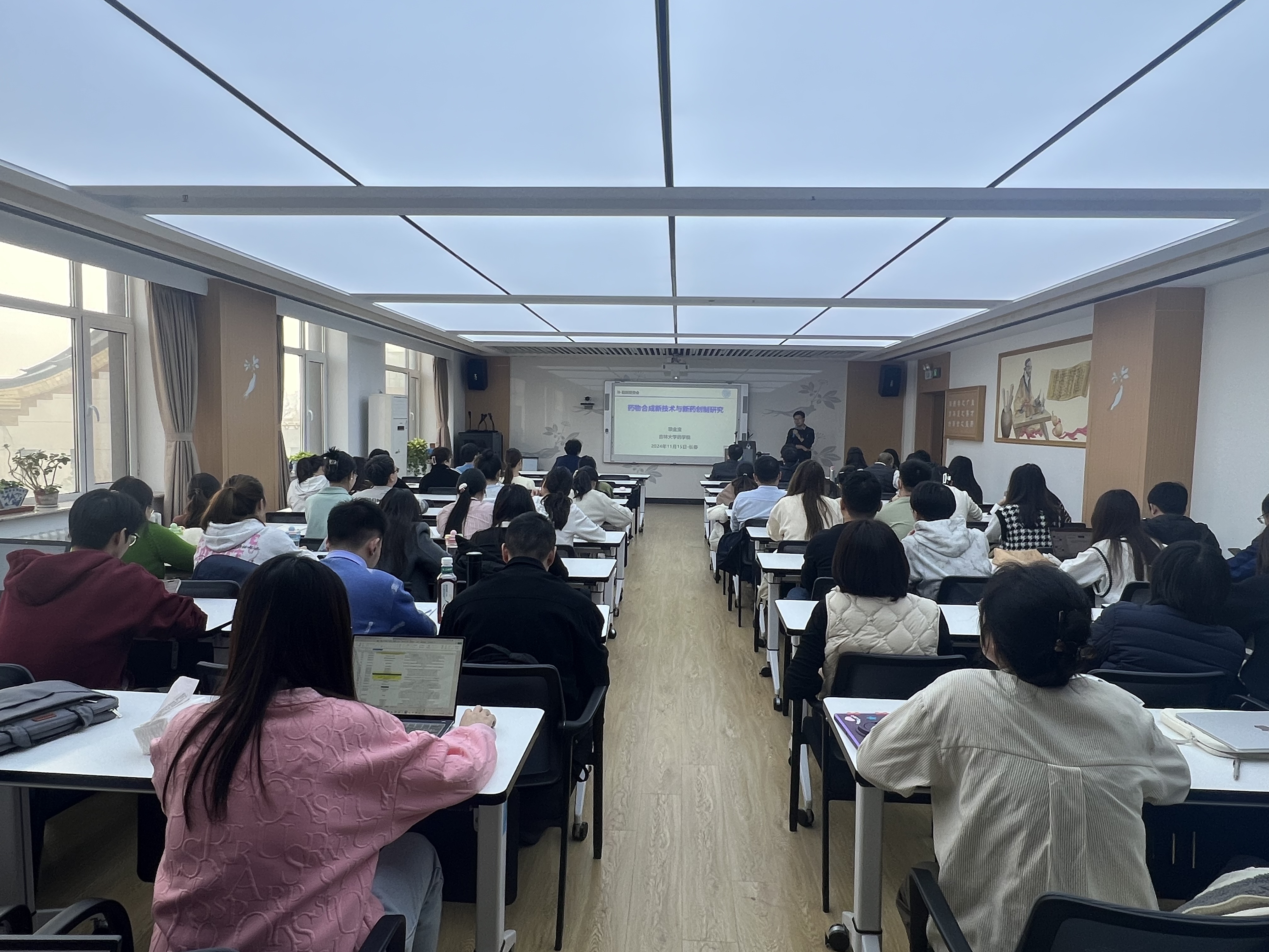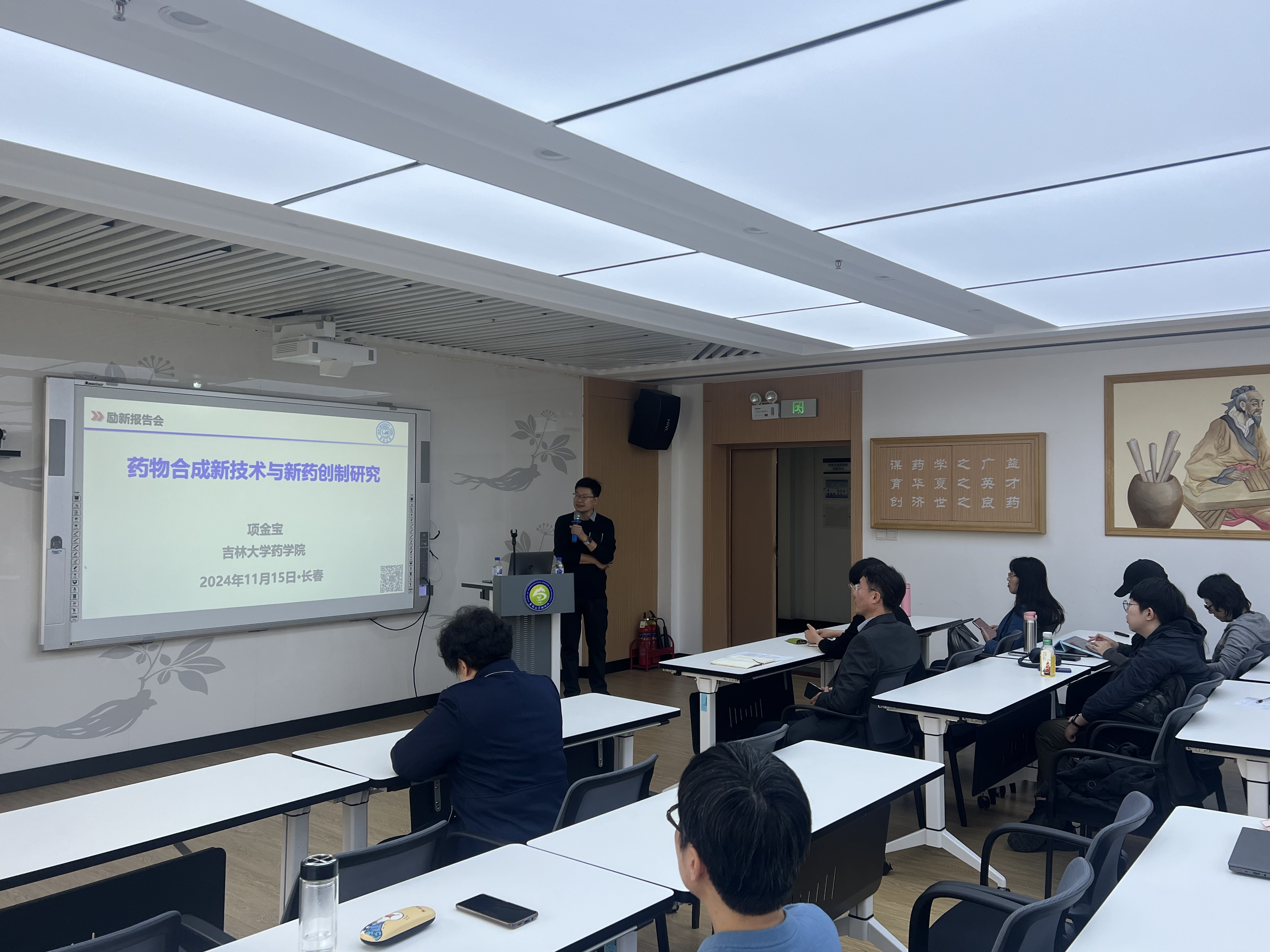 报告会上,励新优秀青年教师培养计划“精英阶段”期满考核通过人员项金宝教授作了题为“药物合成新技术与新药创制研究”的学术报告。在报告中,项金宝教授详细阐述了其课题组在多样性导向合成方法以及有机电合成技术方面取得的进展,通过新方法、新技术的应用,拓展了类药性分子“化学空间”,构建了结构多样的新颖优势结构分子库。此外,项金宝教授还展示了新颖优势结构分子库的应用,结合骨架跃迁策略,开发了新型JAKs抑制剂类抗风湿候选药物,为现场师生提供了宝贵的科研启示和思路。