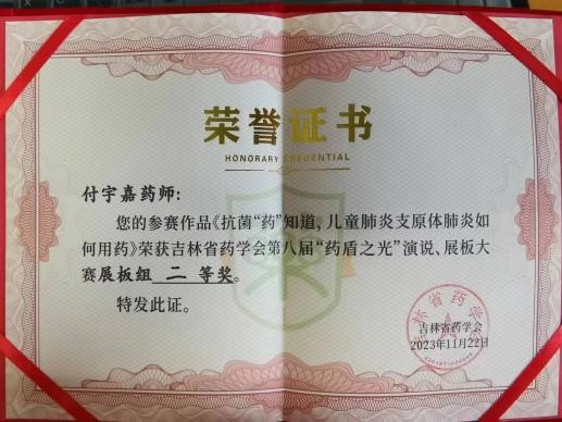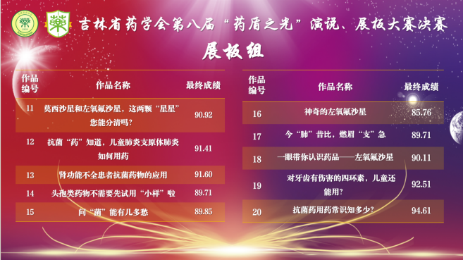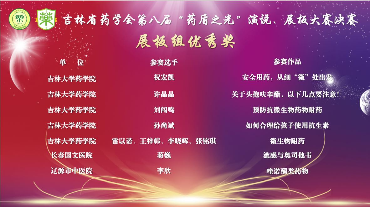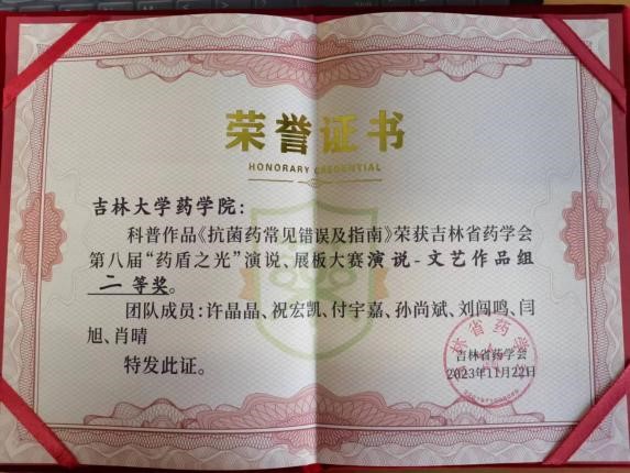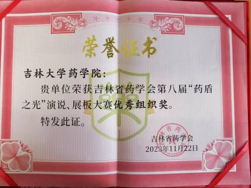 21级、22级学生共参赛作品8项,共获展板组二等奖1项,优秀奖5项;演讲组荣获优秀奖1项和文艺作品组荣获二等奖1项,学院荣获“吉林省药学会优秀组织单位”。