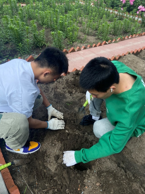 和平校区劳动教育基地。在这片充满生机的土地上,同学们勤勤恳恳、脚踏实地,用心浇灌每一株药材;奋楫扬帆、实干笃行,用爱滋养每一寸土地。志愿者们自行分组进行了杂草拔除、垃圾清理等活动,并对花坛进行了简单美化,让每一株植物都茁壮成长。