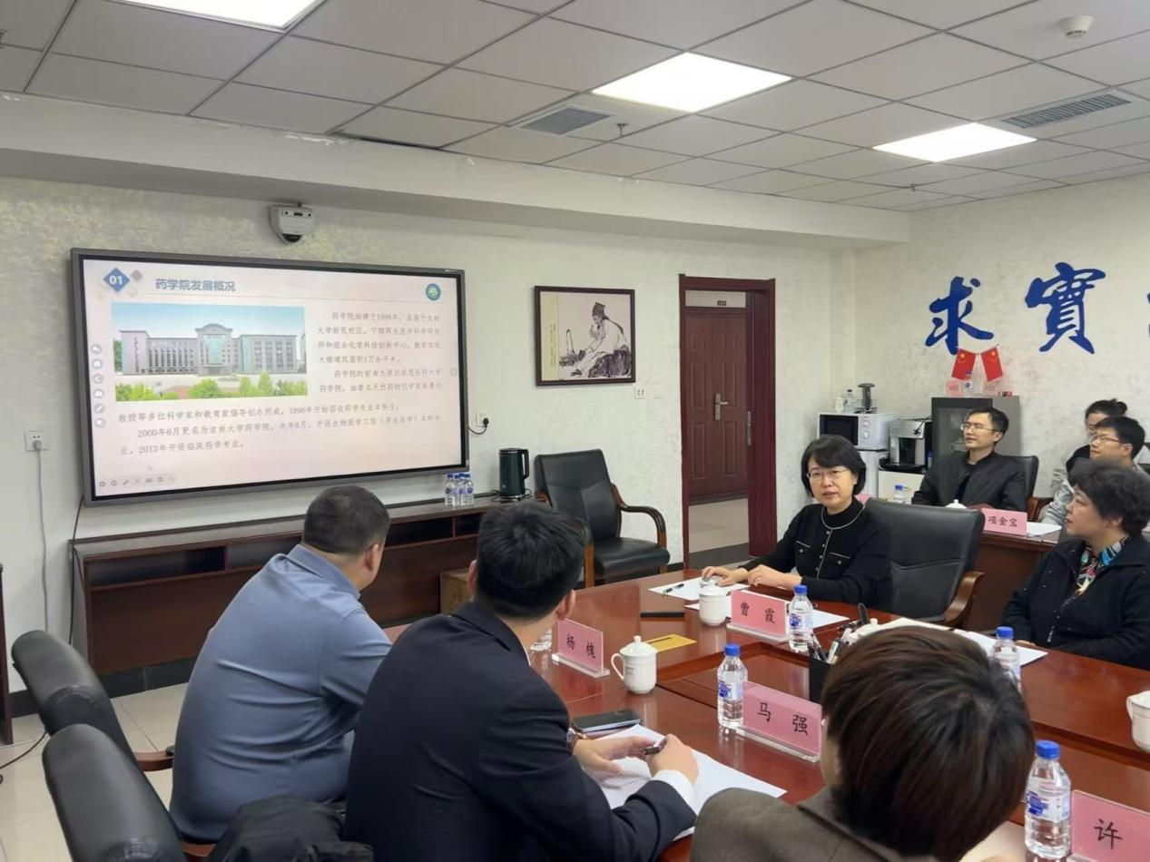的历史沿革、学科建设、师资力量、科研成果、人才培养等方面的情况,特别强调了学院在创新药物研发、中药现代化、生物技术药物等领域的优势和特色。马杰院长表达了双方在科研攻关、实习实践基地建设、学生就业和奖助学金设置方面开展合作的意愿。